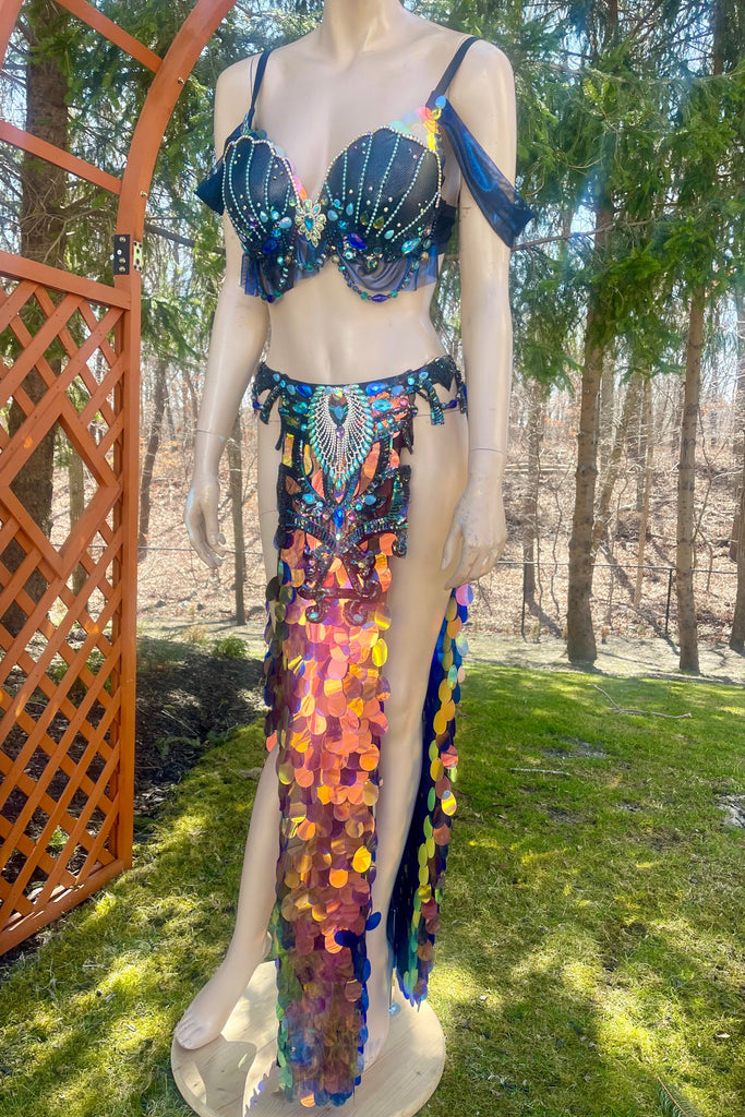 Black Iridescent Blue Rainbow Sequins Mermaid Siren Belly Dancer 2 Piece